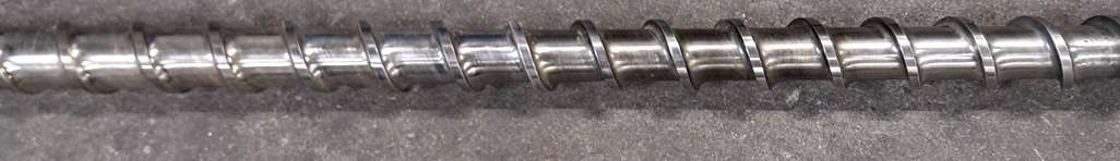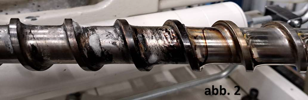 2. Schnecke ungesäubert eingebaut und Maschine zur Reinigung vorbereitet. Die Temperaturen anhand der "Temperatur-Mengen-Übersicht eingestellt und um 10-20% der benötigten Verarbeitungstemperaturen (POM) reduziert.