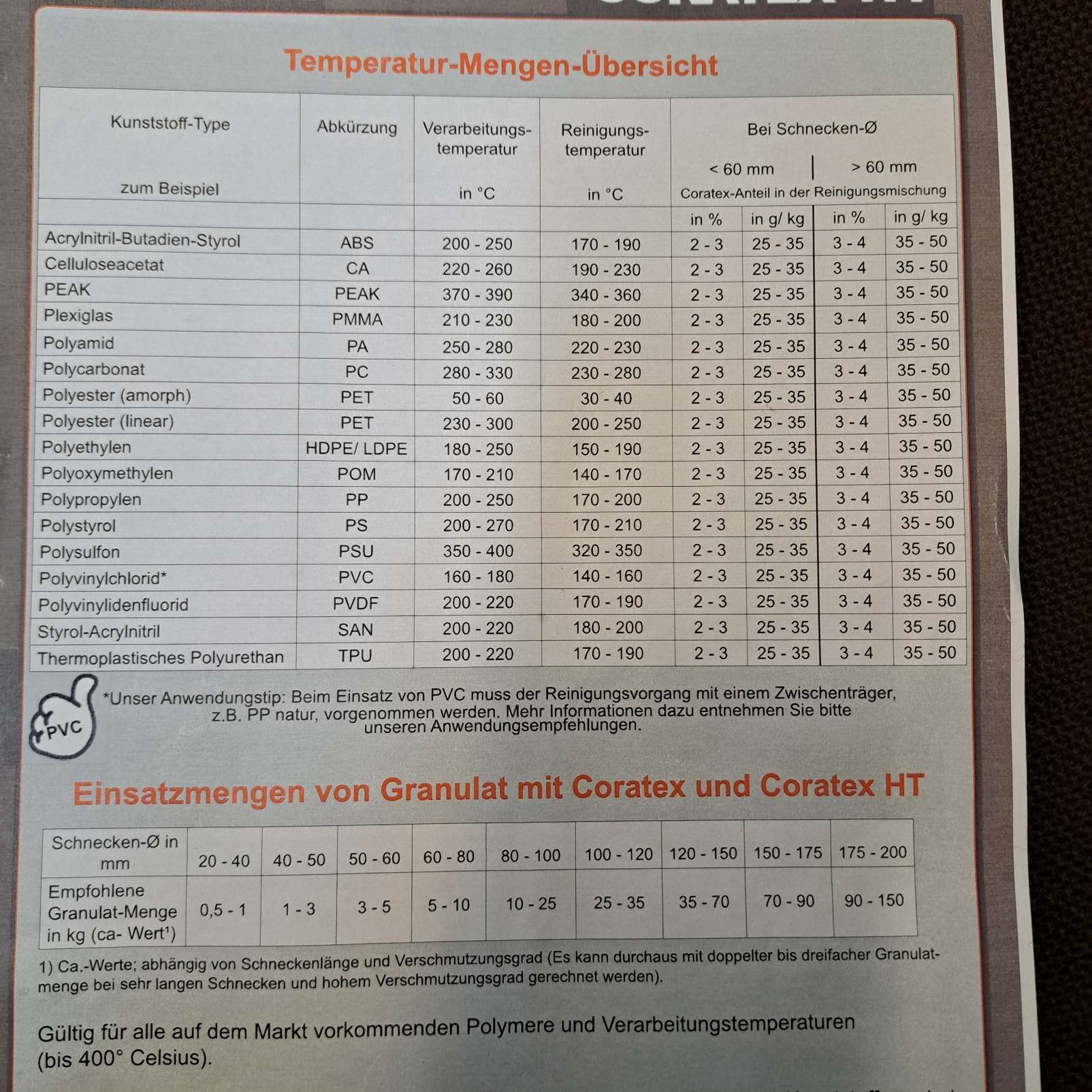 4. 2kg Material (POM) mit 60g CORATEX HT gut vermischen und anschließend an der Maschine die Plastifiziergeschwindigkeit von 100 1/min auf 50 1/min runterstellen und das gesamte Hubvolumen nutzen.